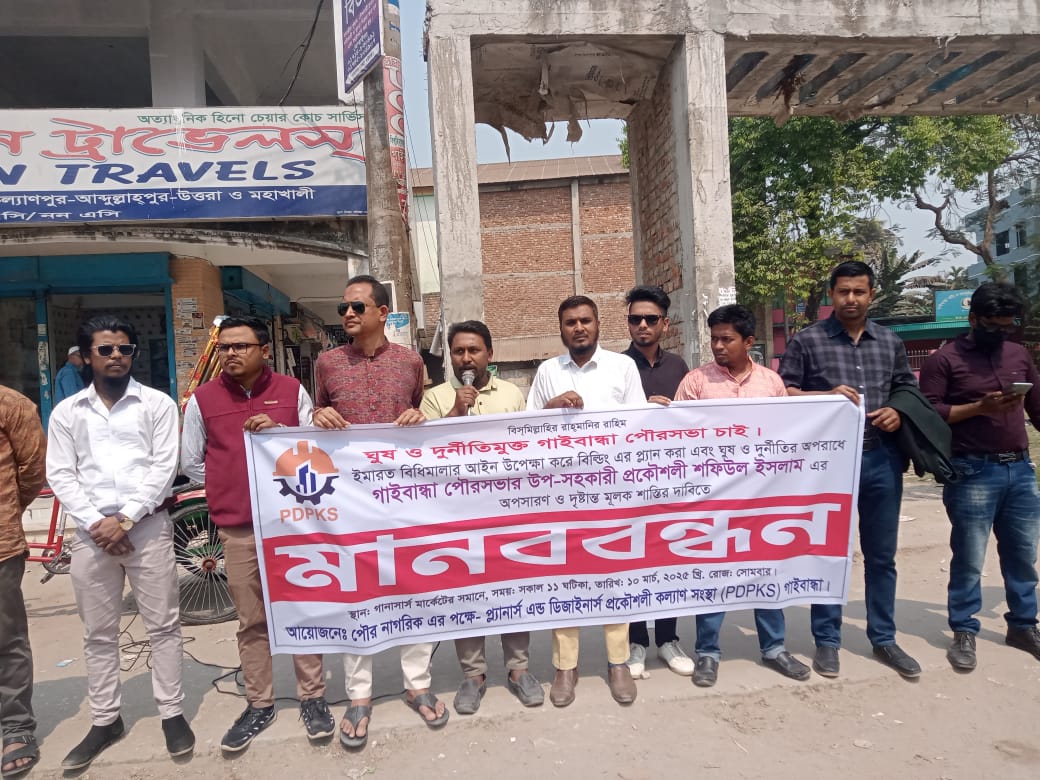 গাইবান্ধা পৌরসভার অধীনে বিভিন্ন আবাসিক অনাবাসিক ভবন নির্মান মালিকদের ঘুষ ও বিভিন্ন হয়রানির স্বীকার হতে হতো। আর নানা প্রকার অপকর্মের সাথে জড়িত ছিলেন পৌরসভার উপ-সহকারী প্রকৌশলী শফিউল ইসলাম। নির্মান মালিকদের কাছ থেকে নানা বাহানা দেখিয়ে নেয়া হত বিভিন্ন অঙ্কের অর্থ। গাইবান্ধা জেলার বিভিন্ন কনসালটেন্সি থেকে প্ল্যান করা হলে প্ল্যানের বিভিন্ন ধরনের অযৌক্তিক ভুল ধরতেন এই শফিউল। প্ল্যান পাসের জন্য ফাইল জমা হলে দীর্ঘদিন ঘুরাত নির্মান মালিককে। প্ল্যান পাশে যদি বাড়তি টাকা না দিত তাহলে সেই নির্মান মালিকের প্ল্যানের ব্যপারে নানা মিথ্যা ও ভুলভাল বুঝিয়ে তিনি নিজেই সেই প্ল্যান করে টাকা হাতিয়ে নিত। তার অপকর্ম দিনদিন বাড়তে থাকলে গাইবান্ধা প্ল্যানার্স এন্ড ডিজাইনার্স প্রকৌশলী কল্যান সংস্থার সকল প্রকৌশলীবৃন্দ নগরকে ঘুষ ও হয়রানিমুক্ত করতে ১০ মার্চ ২০২৫ ইং তারিখে পৌরবাসিকে সংঙ্গে নিয়ে মানববন্ধনের আয়োজন করেন। এসময় উপস্থিত ছিলেন অত্র সংস্থার সাধারণ সম্পাদক প্রকৌশলী মোঃ রোকনউদ্দৌলা, সহ সভাপতি