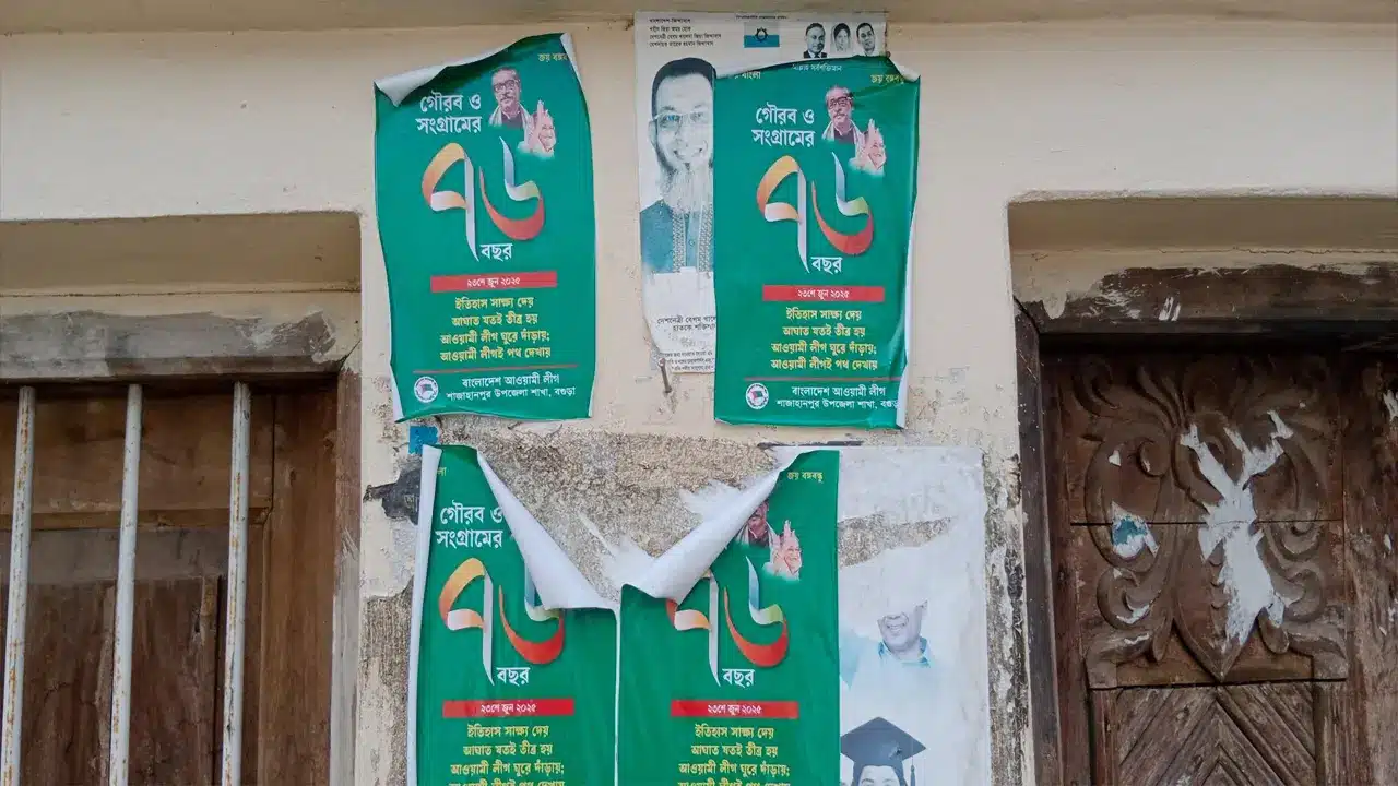 শাজাহানপুর উপজেলায় বিএনপির দলীয় কার্যালয়ে আওয়ামী লীগের পোস্টার।
