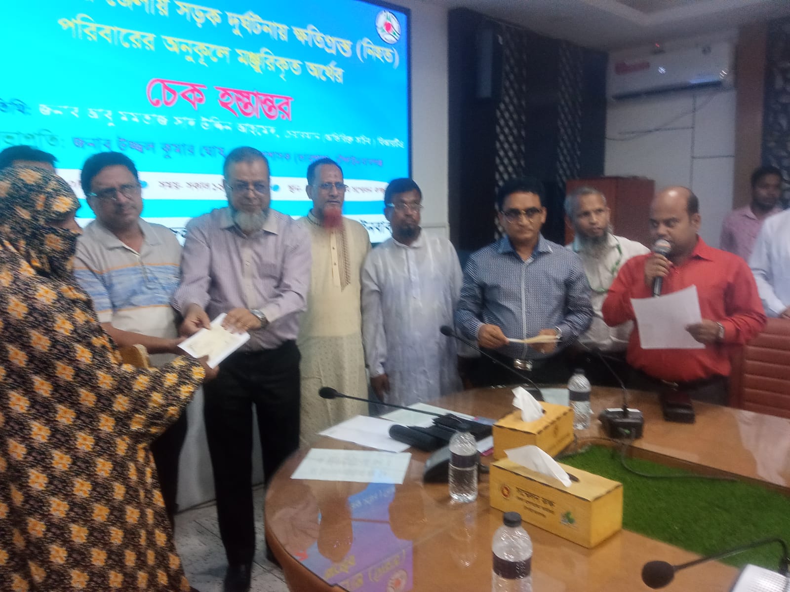 চাঁপাইনবাবগঞ্জে সড়ক দূর্ঘটনায় ক্ষতিগ্রস্ত (নিহত) পরিবারের মাঝে চেক হস্তান্তর