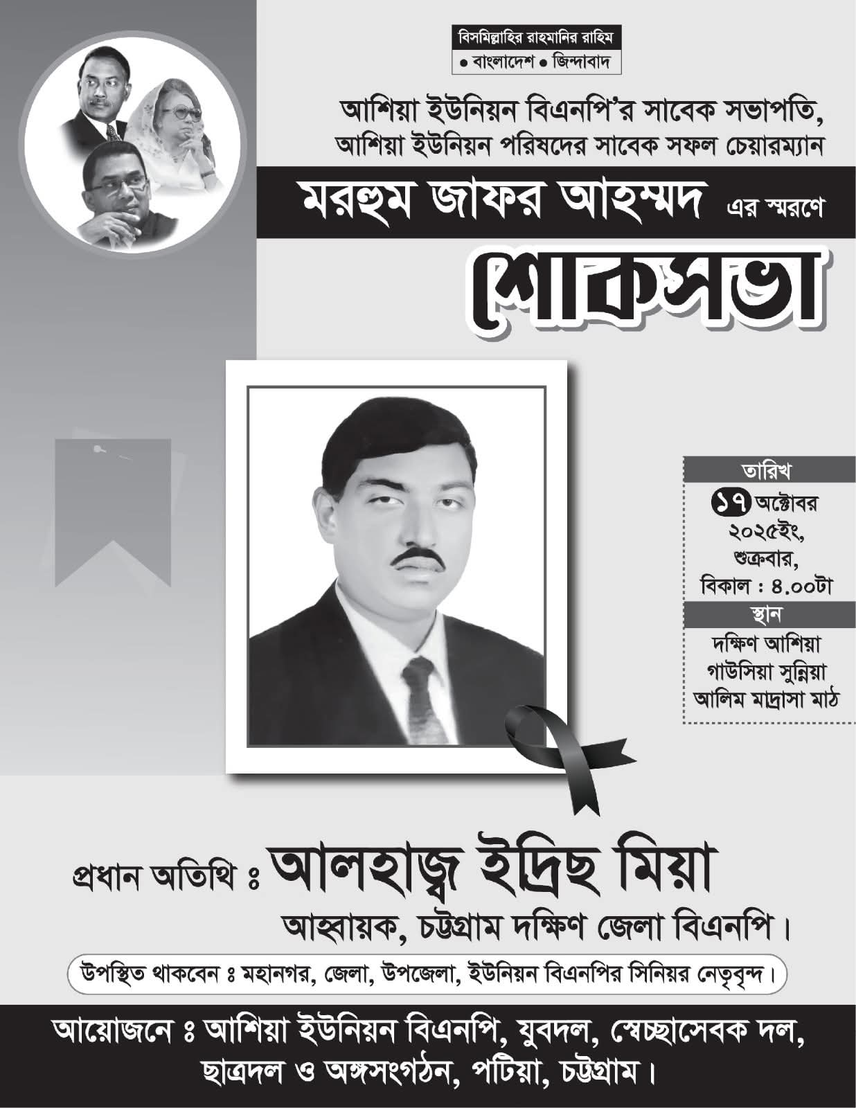 আগামী ১৭অক্টোবর-২৫,শুক্রবার পটিয়া জাফর আহম্মদ চেয়ারম্যান এর শোকসভা