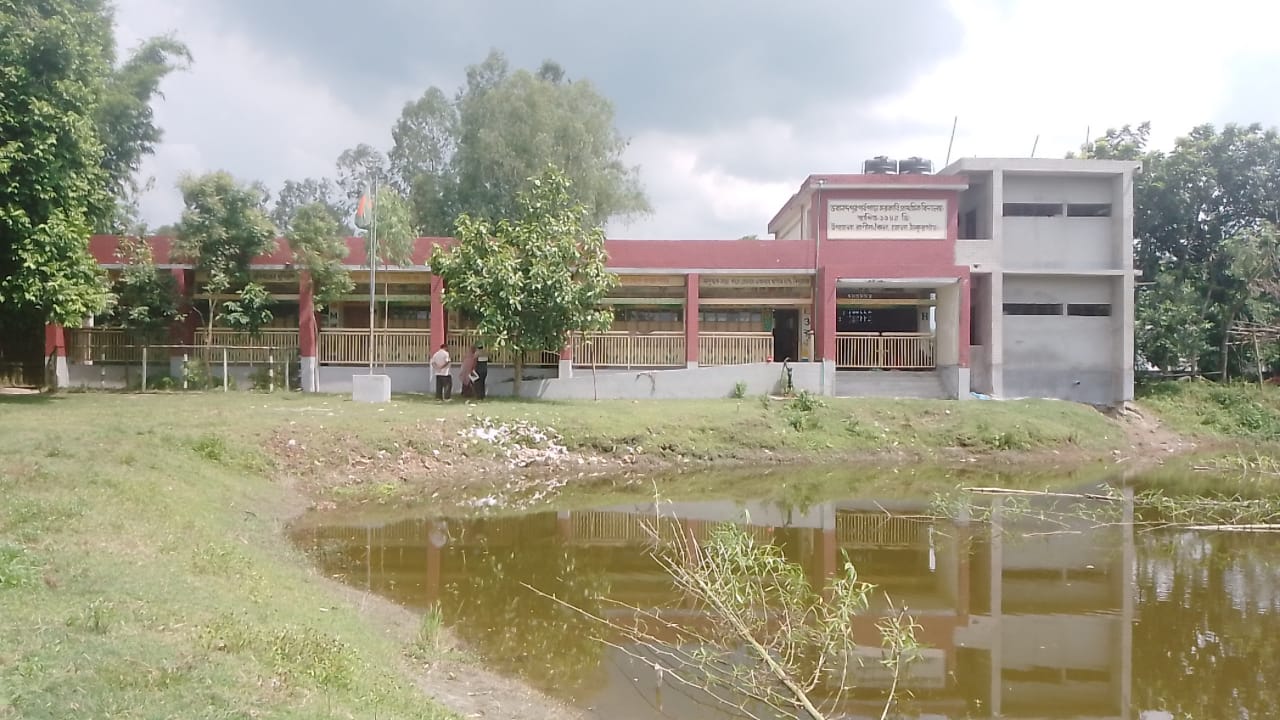 মাঠে পুকুর ঝুঁকিতে ক্লাস করছে ভবানন্দপুর প্রাইমারীর শিক্ষার্থীরা