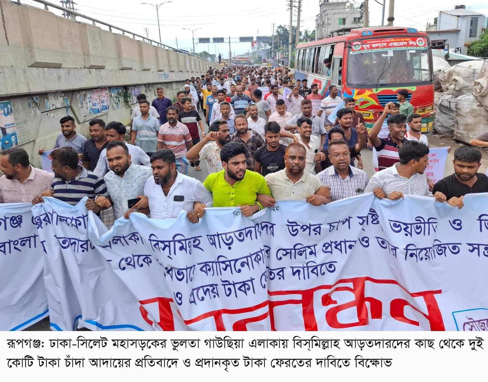 রূপগঞ্জে বিসমিল্লাহ আড়তদারদের জিম্মি করে দুই কোটি টাকা চাঁদা আদায়ের প্রতিবাদে মানববন্ধন বিক্ষোভ