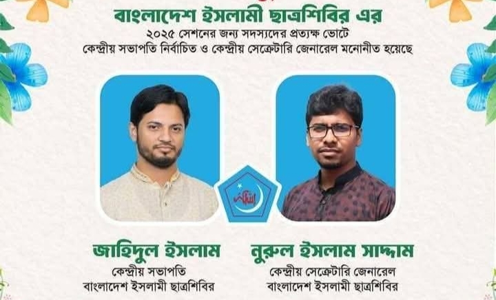 ২০২৫ সেশনের জন্য বাংলাদেশ ইসলামী ছাত্রশিবিরের কেন্দ্রীয় সভাপতি নির্বাচন ও সেক্রেটারি জেনারেল মনোনয়ন সম্পন্ন হয়েছে। সারাদেশের সদস্যদের অনলাইন ভোটে কেন্দ্রীয়